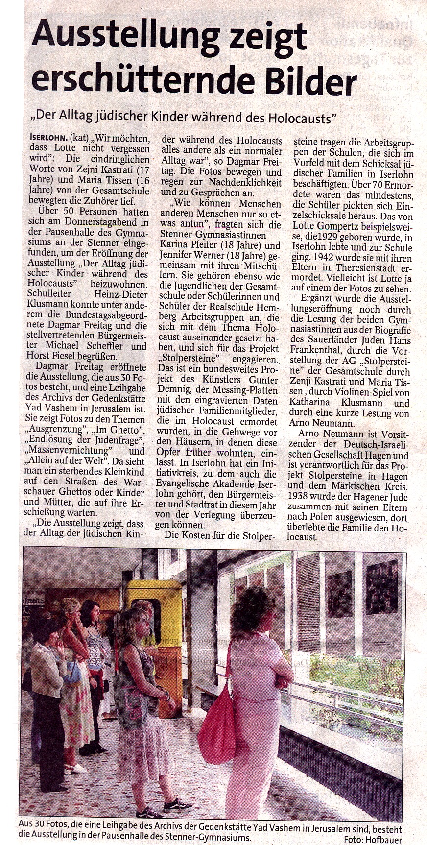 01.09.2005 - 06.09.2005 im Gymnasium An der Stenner 07.09.2005 - 12.09.2005 im Foyer des Iserlohner Rathaus 13.09.2005 - 20.09.2005 in der Gesamtschule am Nußberg |